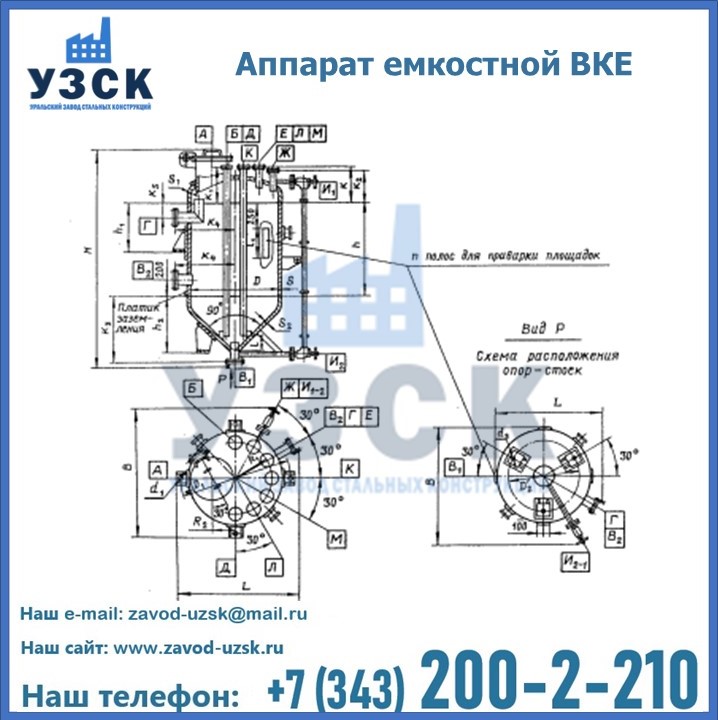 Емкостные аппараты ВКЭ представляют емкость с эллиптической крышей и коническим днищем. аппарат может использоваться в Симферополе для приема и хранения жидкостей и взрыво- и пожароопасных веществ. Создаваемое давление не должно превышать 0,6; 1,0 МПа. Емкости ВКЭ выполняются как цельносварные. Используется марка стали, отвечающая степени агрессивности продукта и температуре эксплуатации.